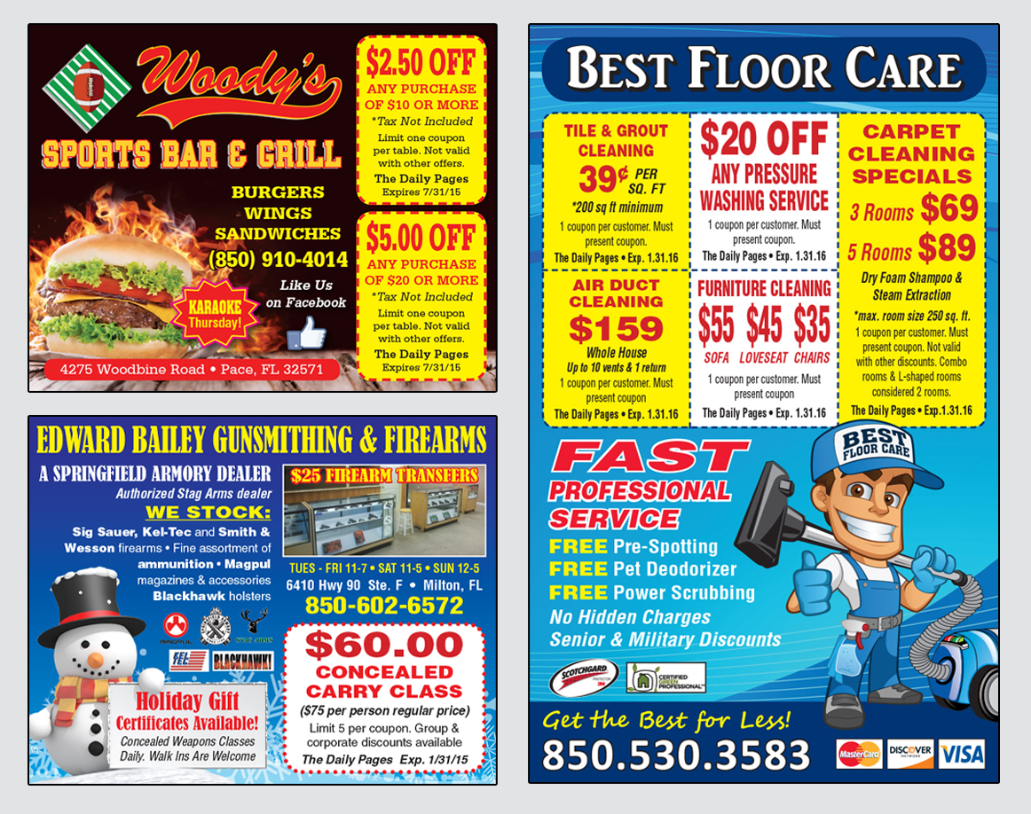 Coupon ads appearing in various issues of The Daily Pages. Creating these ads was challenging at times, due to having to work around the customer's copy requirements and sometimes less than high quality supplied logos or other elements.